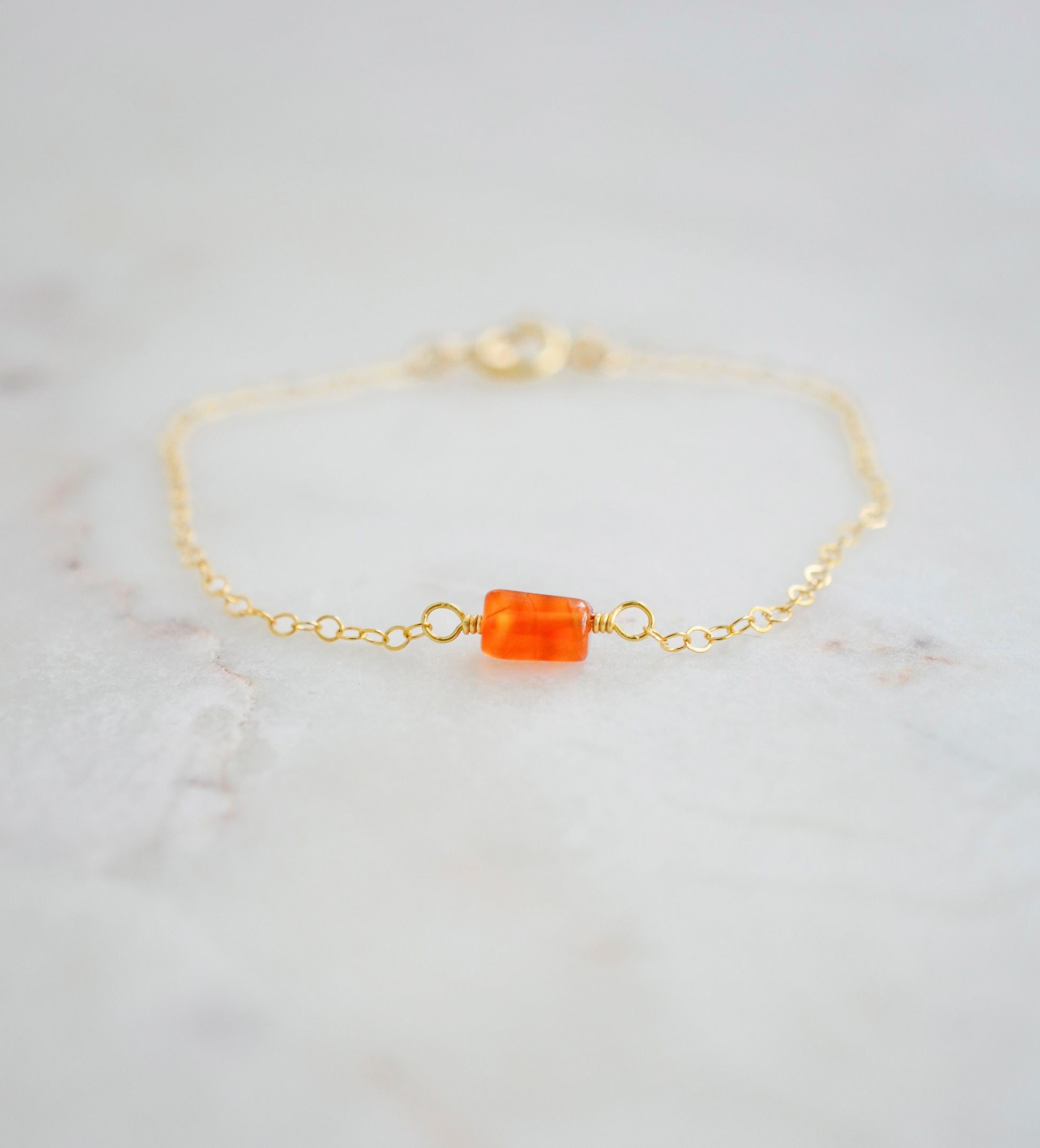 Add some color to your wardrobe with Carnelian! This bracelet features a handmade, smooth polished Carnelian gemstone set onto a sterling silver or 14k gold filled chain. Most stones have natural banding in shades of dark and light orange, as well as some clear areas.