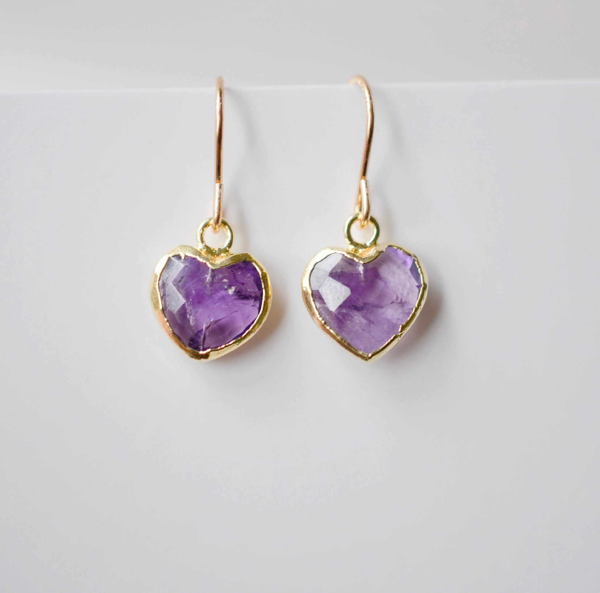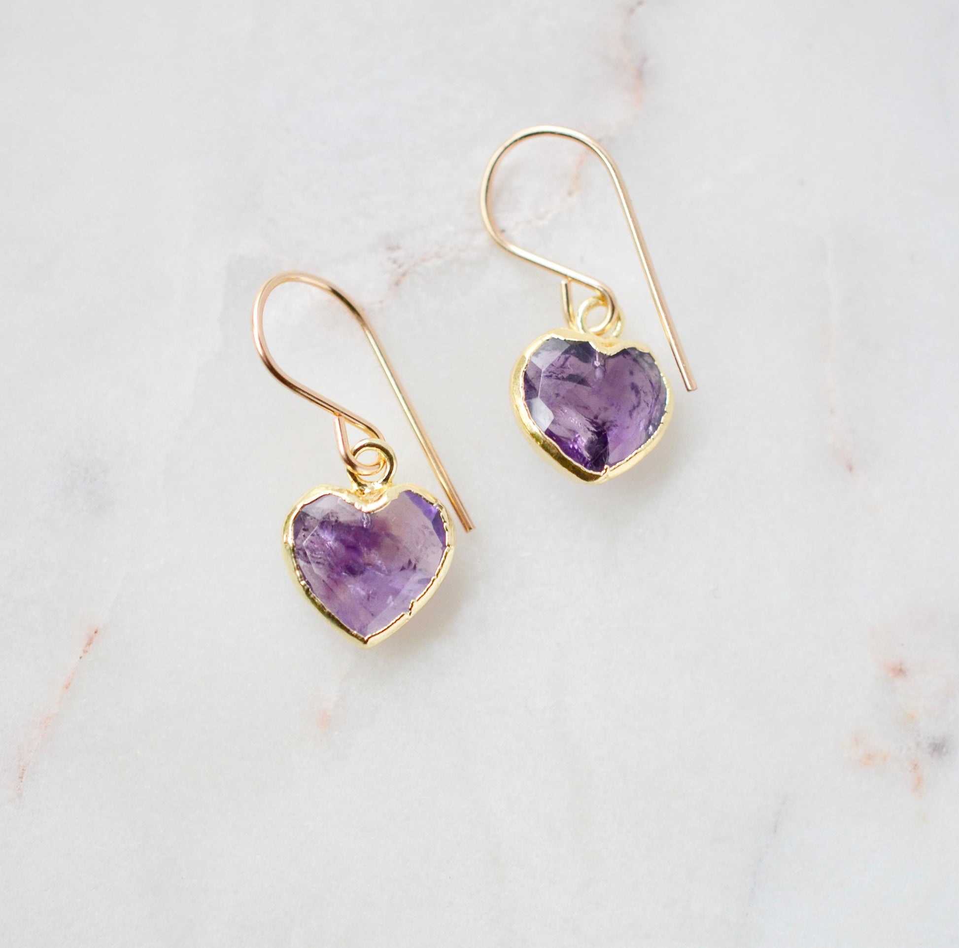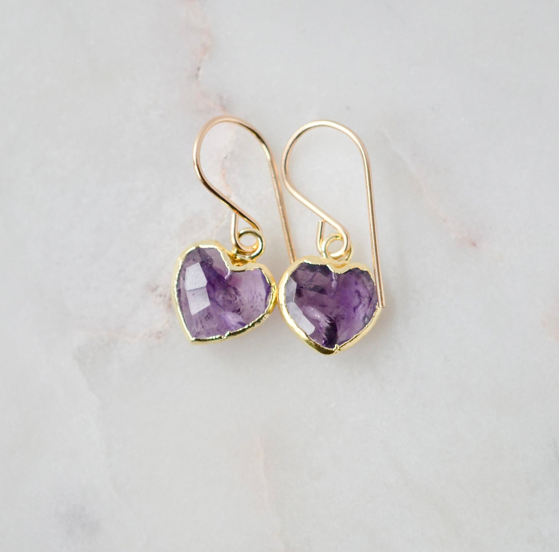 Nothing says love more than these genuine Amethyst heart earrings! Great for an everyday minimalist style, these dainty stone dangles also make the perfect romantic gift for you, your wife, girlfriend, friend, or for Valentine's Day. Each stone is bezeled in 22k gold and set on 14k gold filled earring hooks.