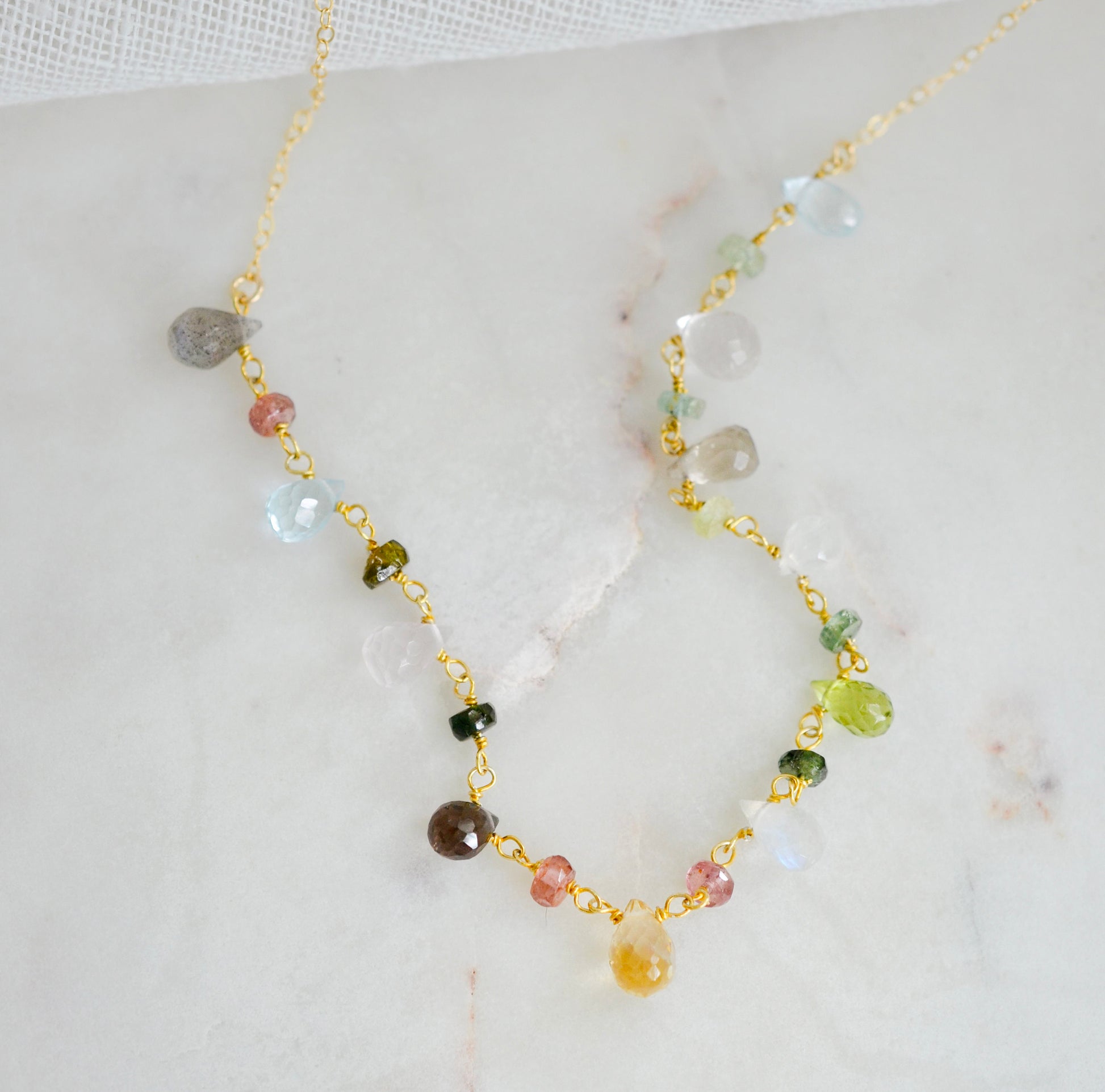 Add some sparkle and color to your everyday jewelry with this stunning multi-gemstone necklace! Featuring a variety of faceted teardrop crystals, this necklace is handmade with your choice of sterling silver or 22k gold vermeil. Each piece is unique with its own set of varying gemstones, never to be replicated!