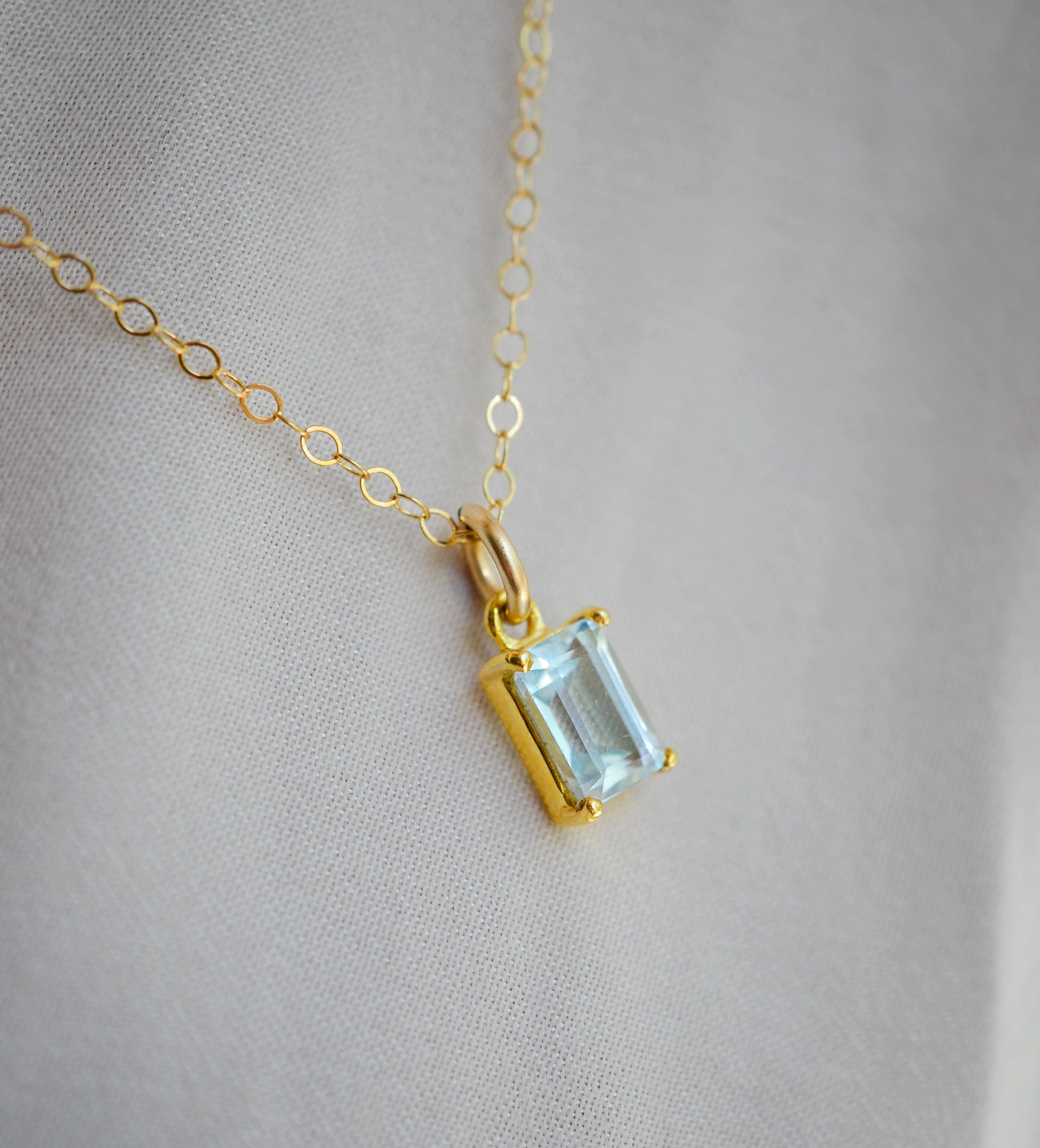 Get ready to make a splash with this gorgeous necklace handmade with a natural Aquamarine gemstone set in a 22k gold vermeil bezel then suspended from a 14k gold filled chain. This pale blue crystal will add a touch of sparkle to any outfit, making you feel like a total gem (pun intended).