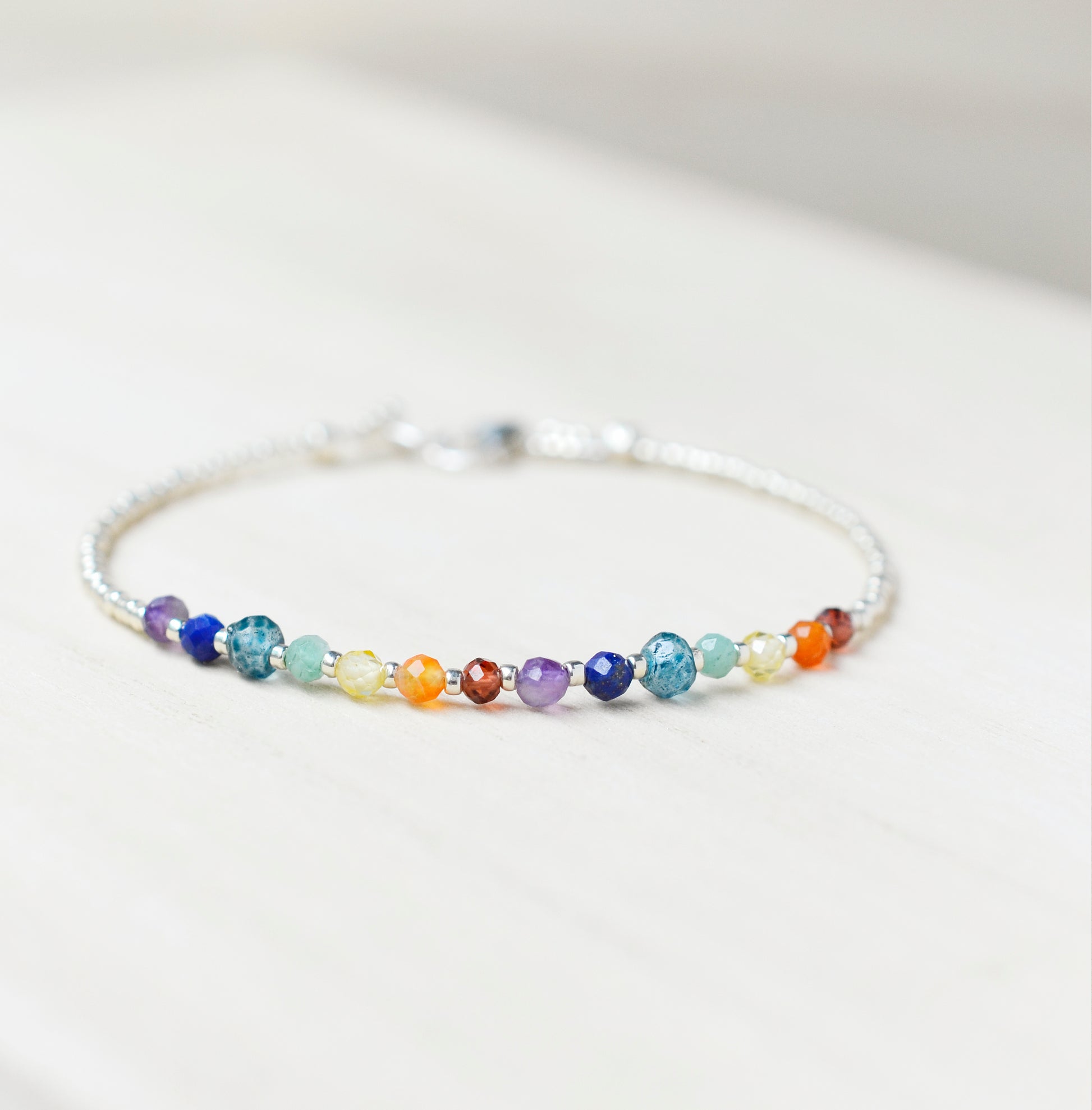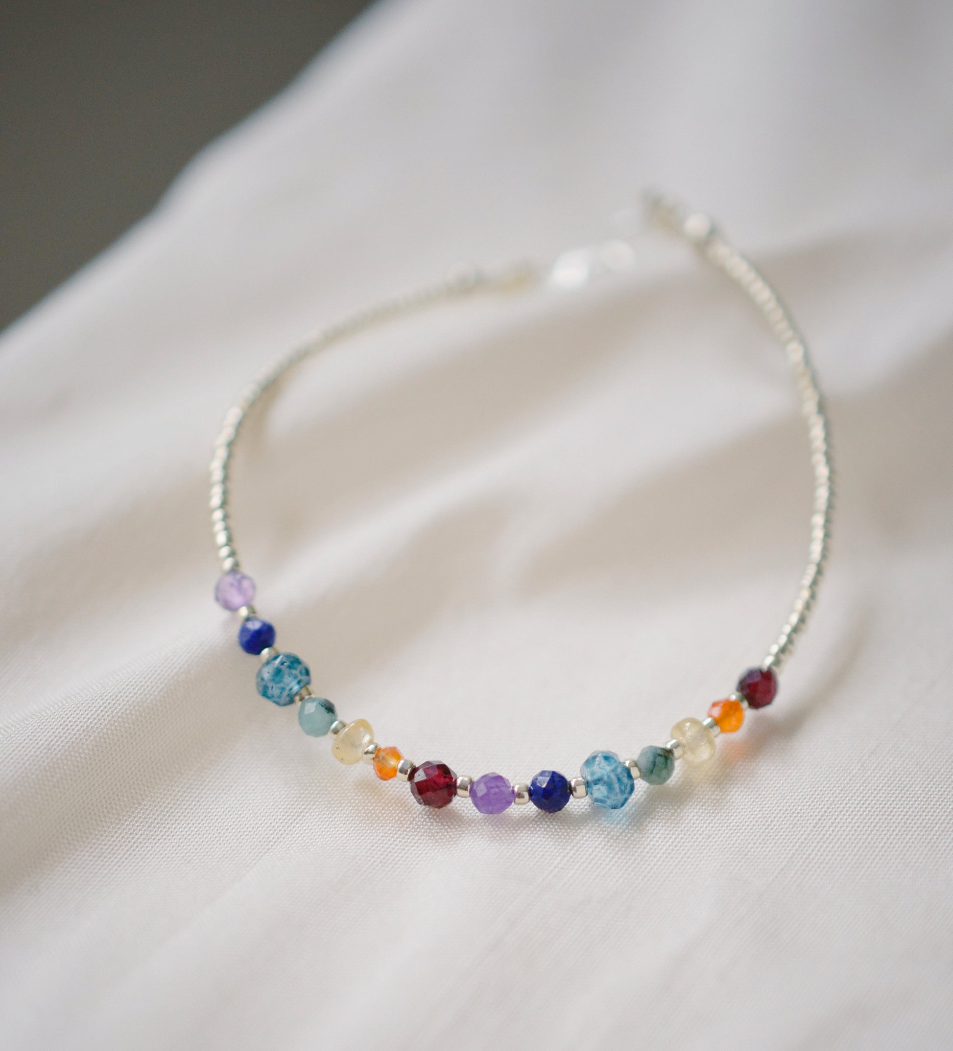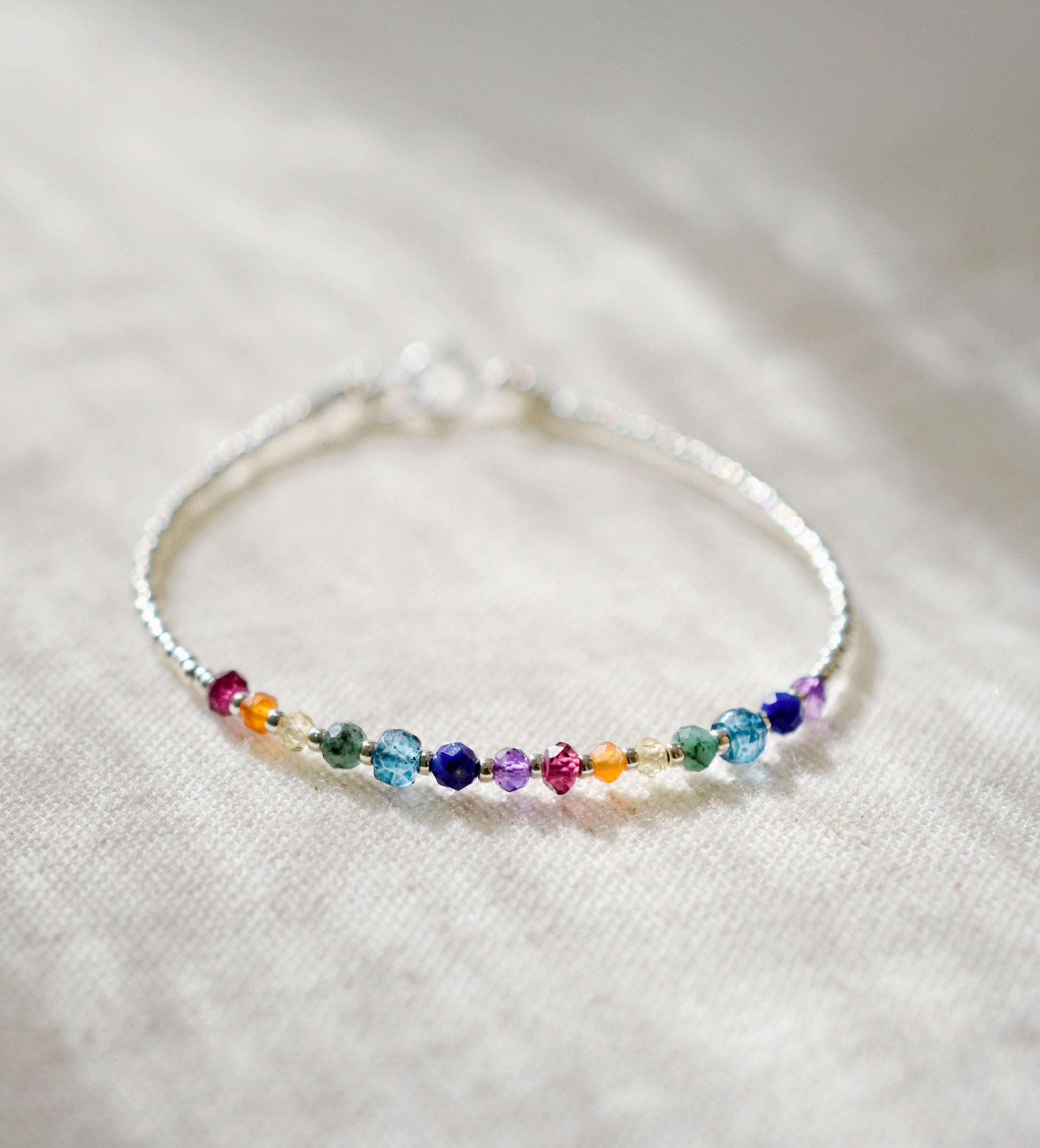 This bracelet is handcrafted with your choice of sterling silver or 14k gold filled, gemstones, and tiny accent beads. Gemstones include: