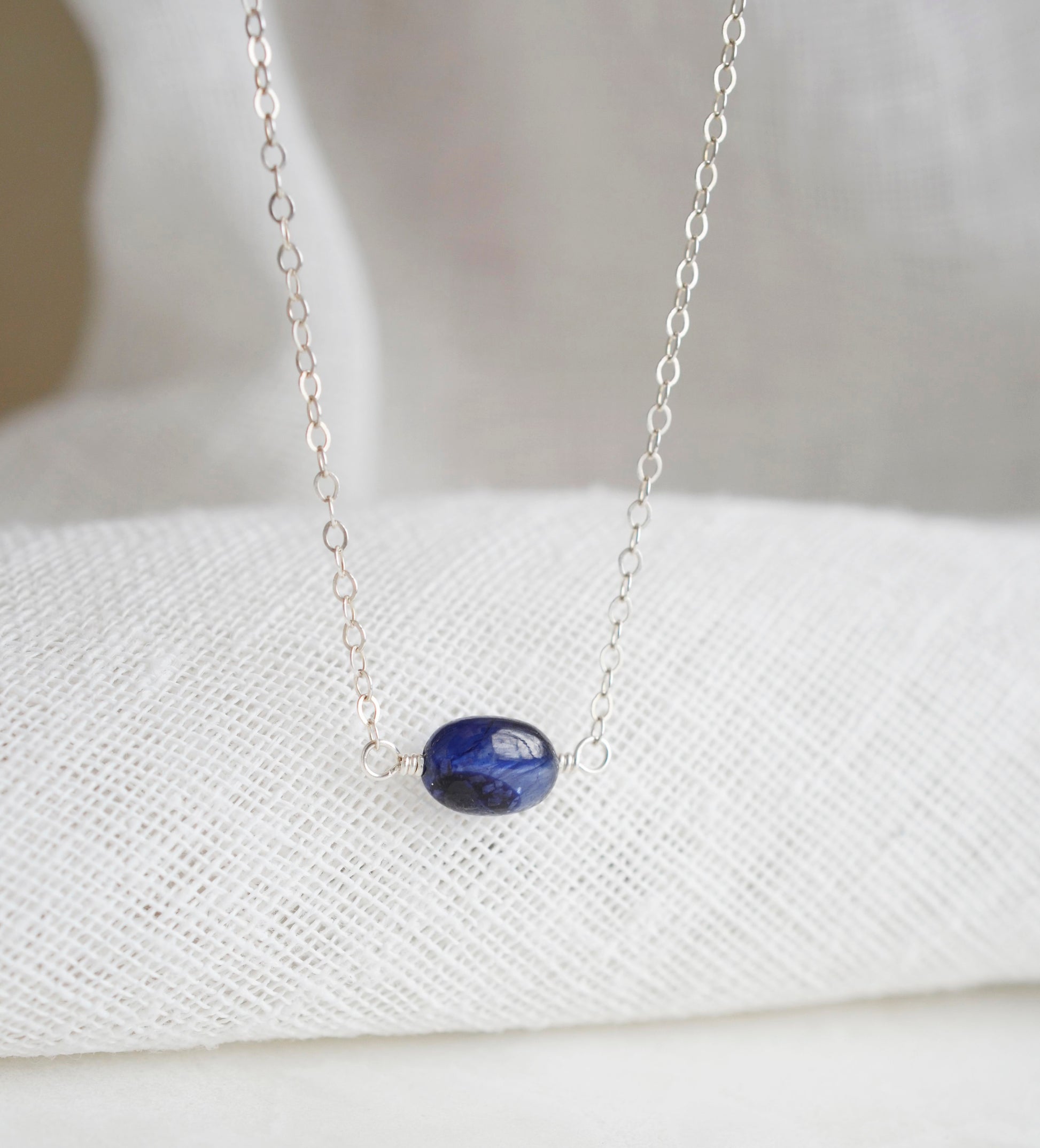 This necklace is handcrafted with a smooth polished, oval-shaped, blue Sapphire. Its color is dark blue. The sapphire sizes range from 8mm to 11mm (.3” to .4“).The chain and clasp are available in your choice of sterling silver or 14k gold fill.