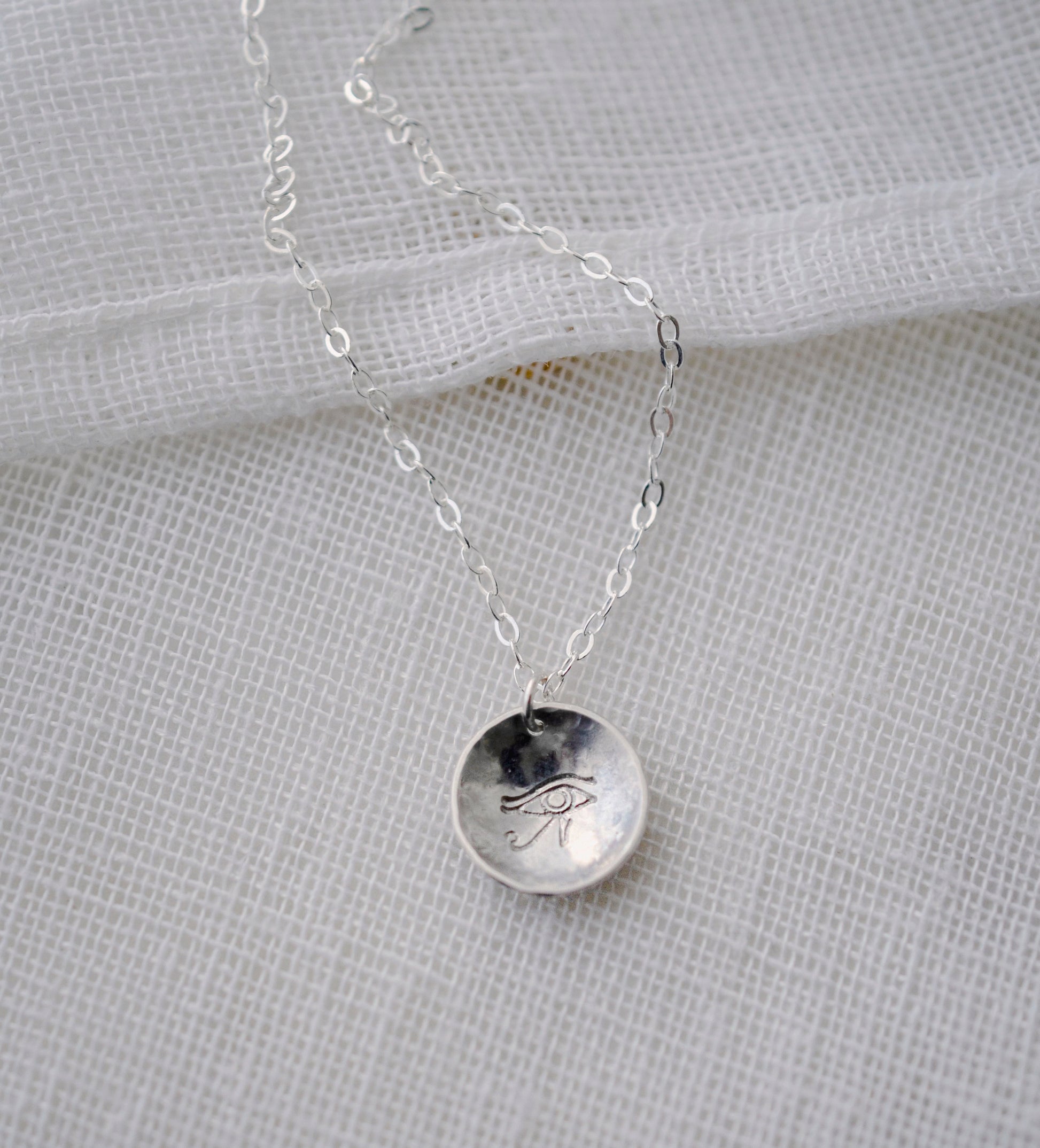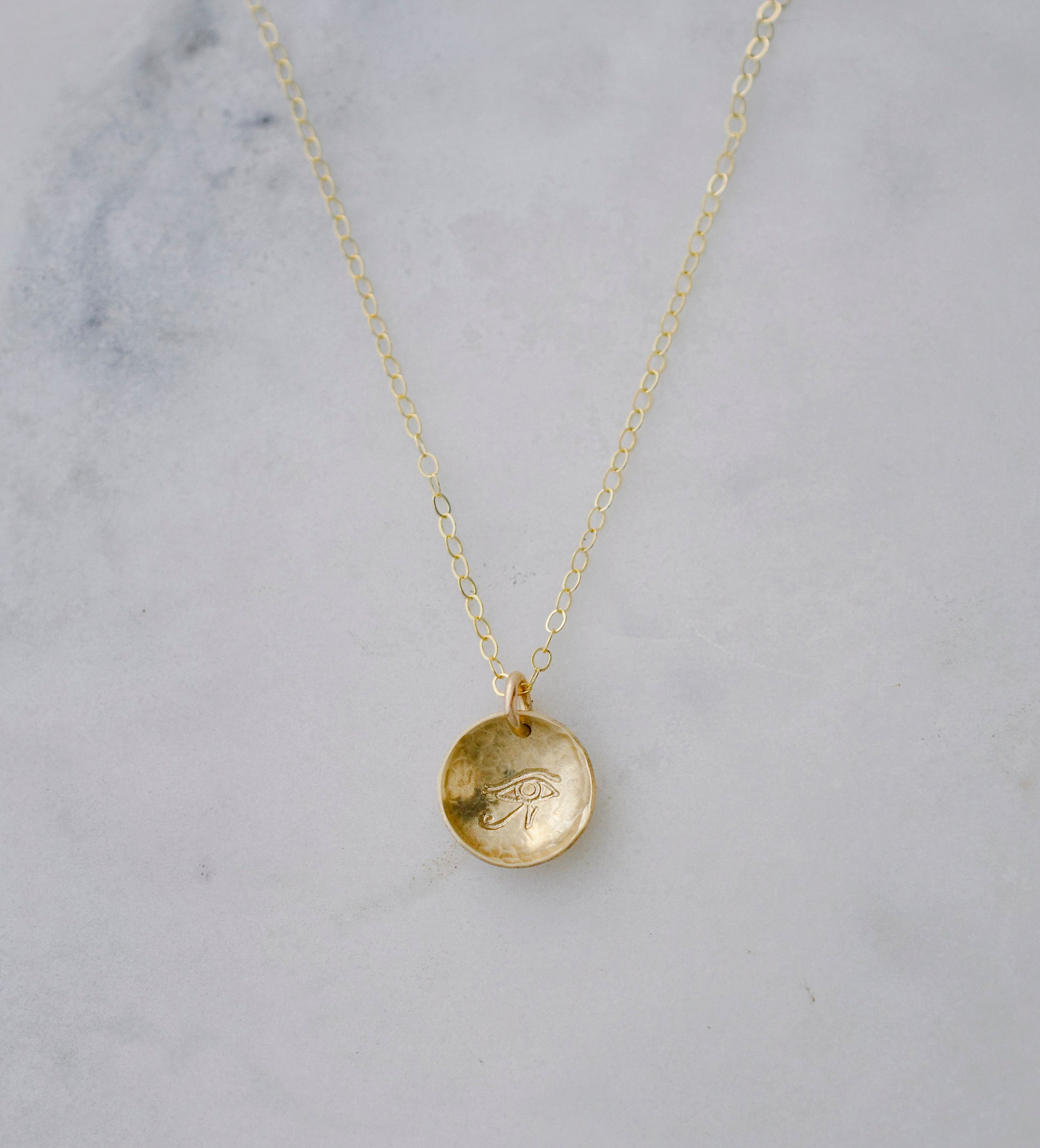 This necklace is handcrafted with a bowl-shaped, hammered disc with the Eye of Horus at its center. It comes in sterling silver or 14k gold-filled.