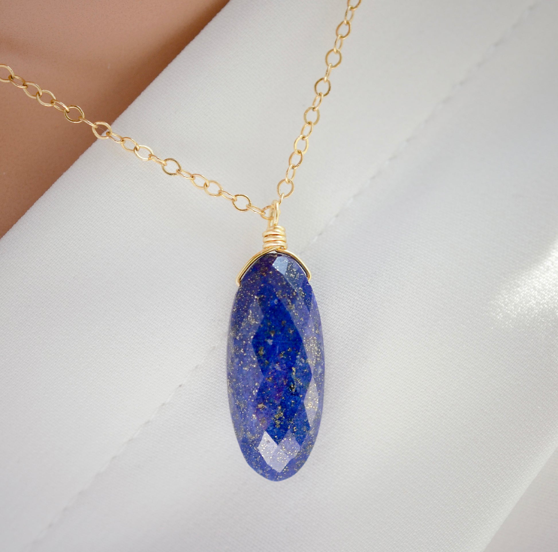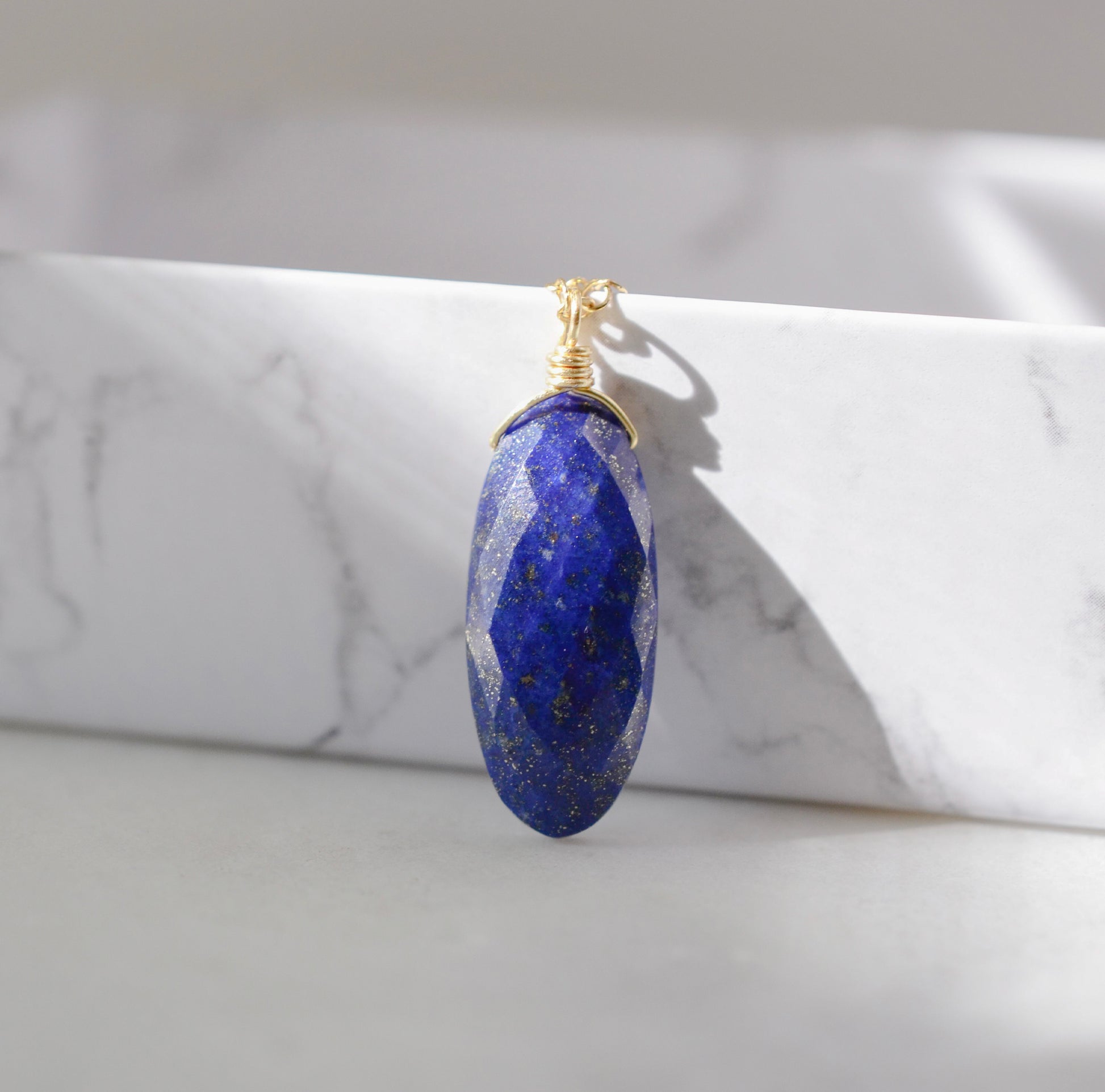 This handmade necklace features a faceted oval Lapis Lazuli stone. Each natural stone is unique, with beautiful hints of pyrite and white calcite. Choose your preferred chain: sterling silver or 14k gold-filled.