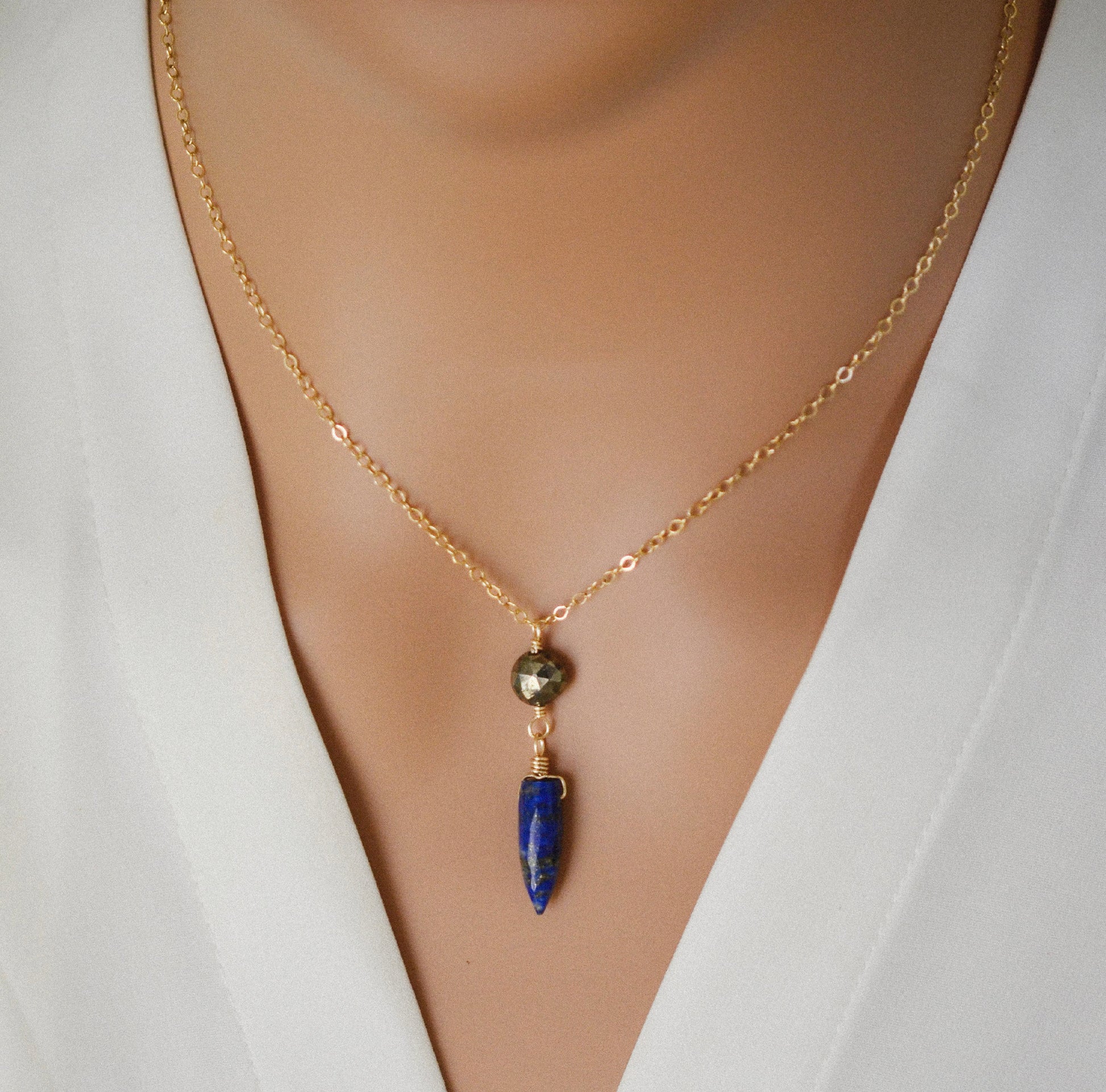 This Lapis Lazuli and Pyrite point pendant is the perfect minimalist necklace that's classy enough for everyday or that special occasion. It features genuine, faceted gemstones on your choice of a sterling silver or 14k gold filled cable chain. Layer it with other jewelry or wear it alone for a dainty style!