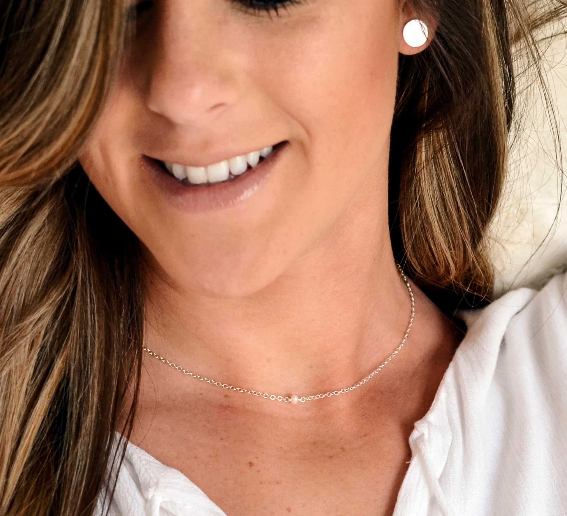 This necklace features a tiny natural freshwater pearl on your choice of chain: Sterling Silver or 14kt Gold Filled.