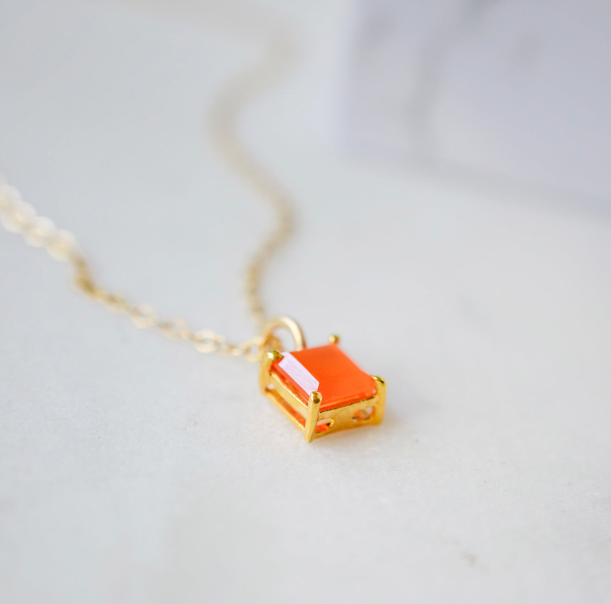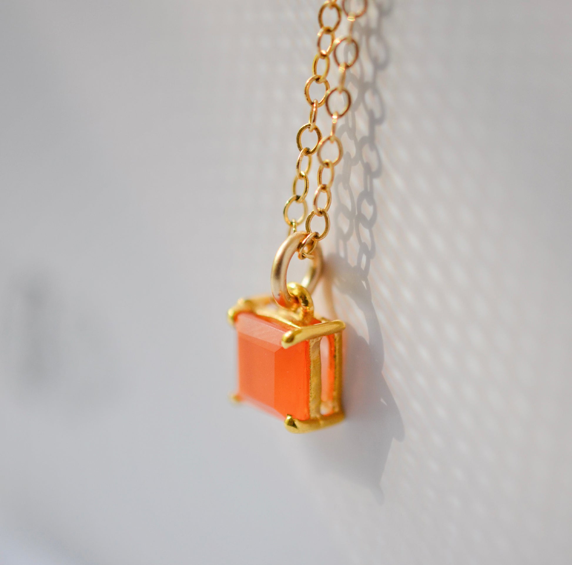 Liven up your day with a touch of Carnelian! This necklace is handmade with a faceted, real Carnelian gemstone on a 14k gold filled chain. The stone is emerald cut, except in a square shape, and is set in hypoallergenic 22k gold plated prongs that are free from nickel, lead, and cadmium.
