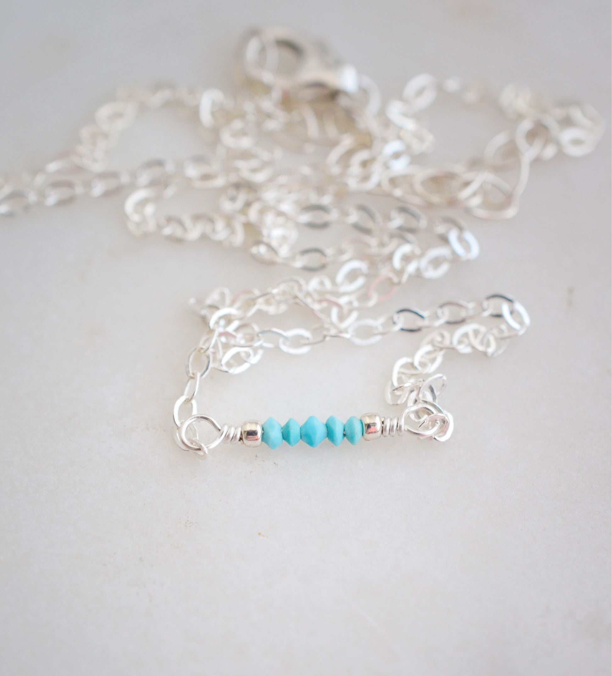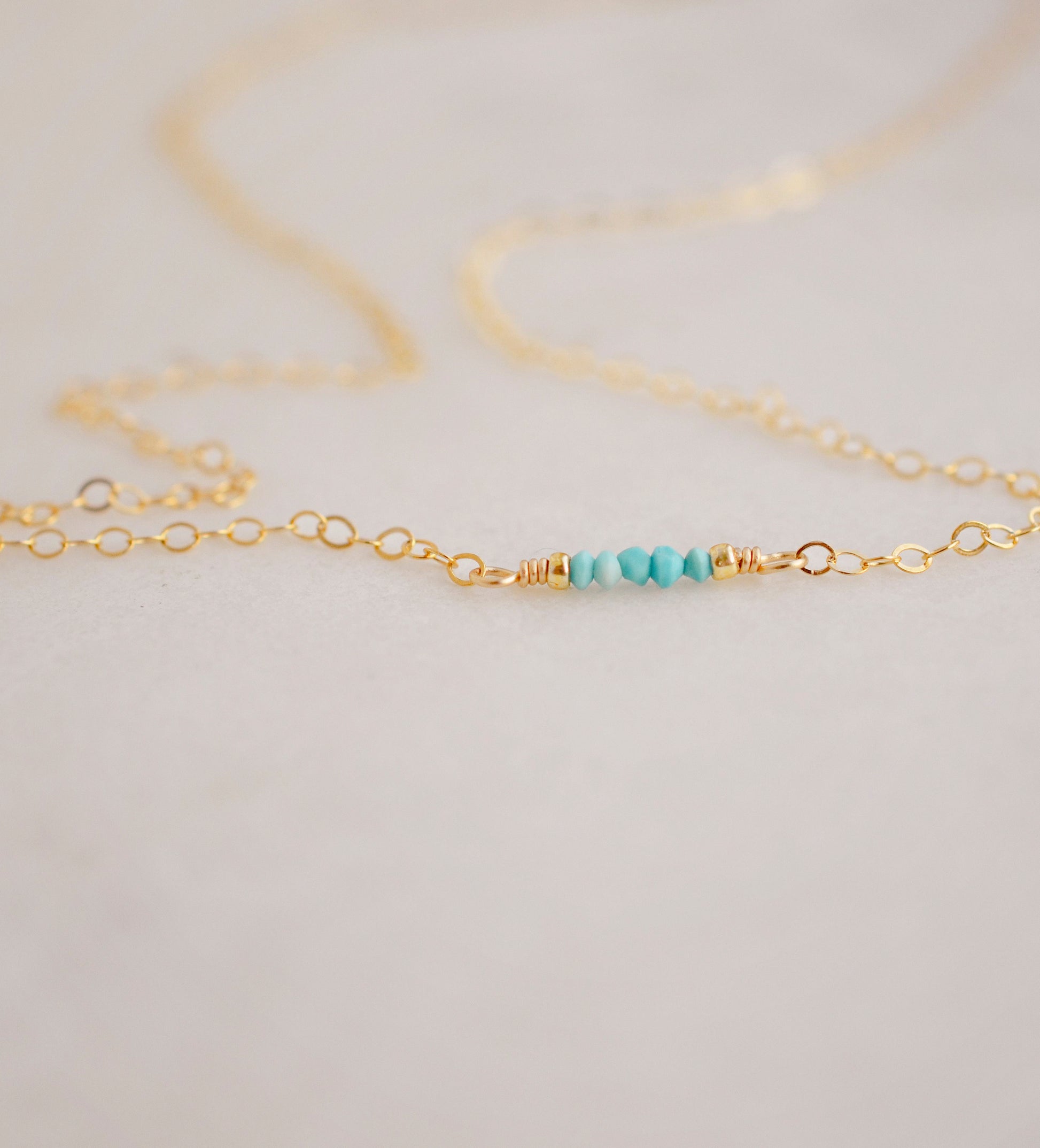 Love a minimalist style? Then this necklace is a must for you! Small, natural Arizona Turquoise stones make up this special piece. Choose to have this necklace made in either 14k gold fill or sterling silver.