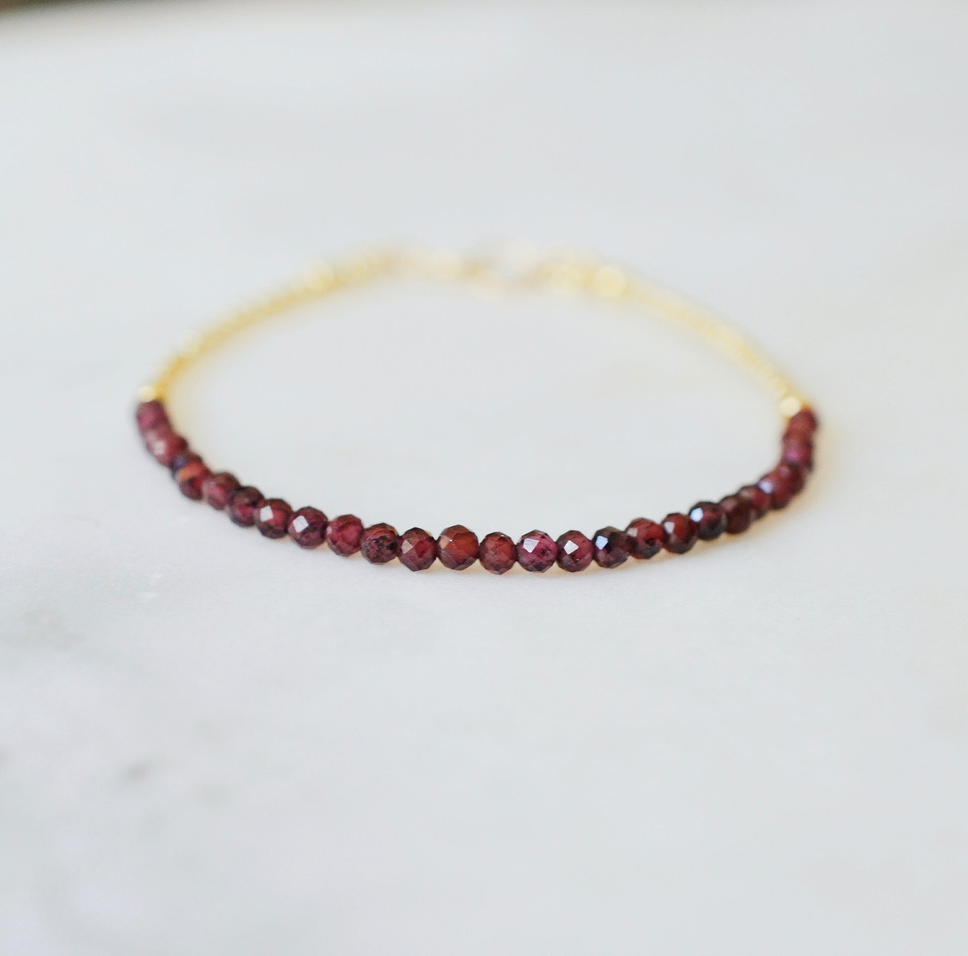 This beaded bracelet is lovingly crafted with natural burgundy red garnet gemstones and available in either 14k gold filled or sterling silver.