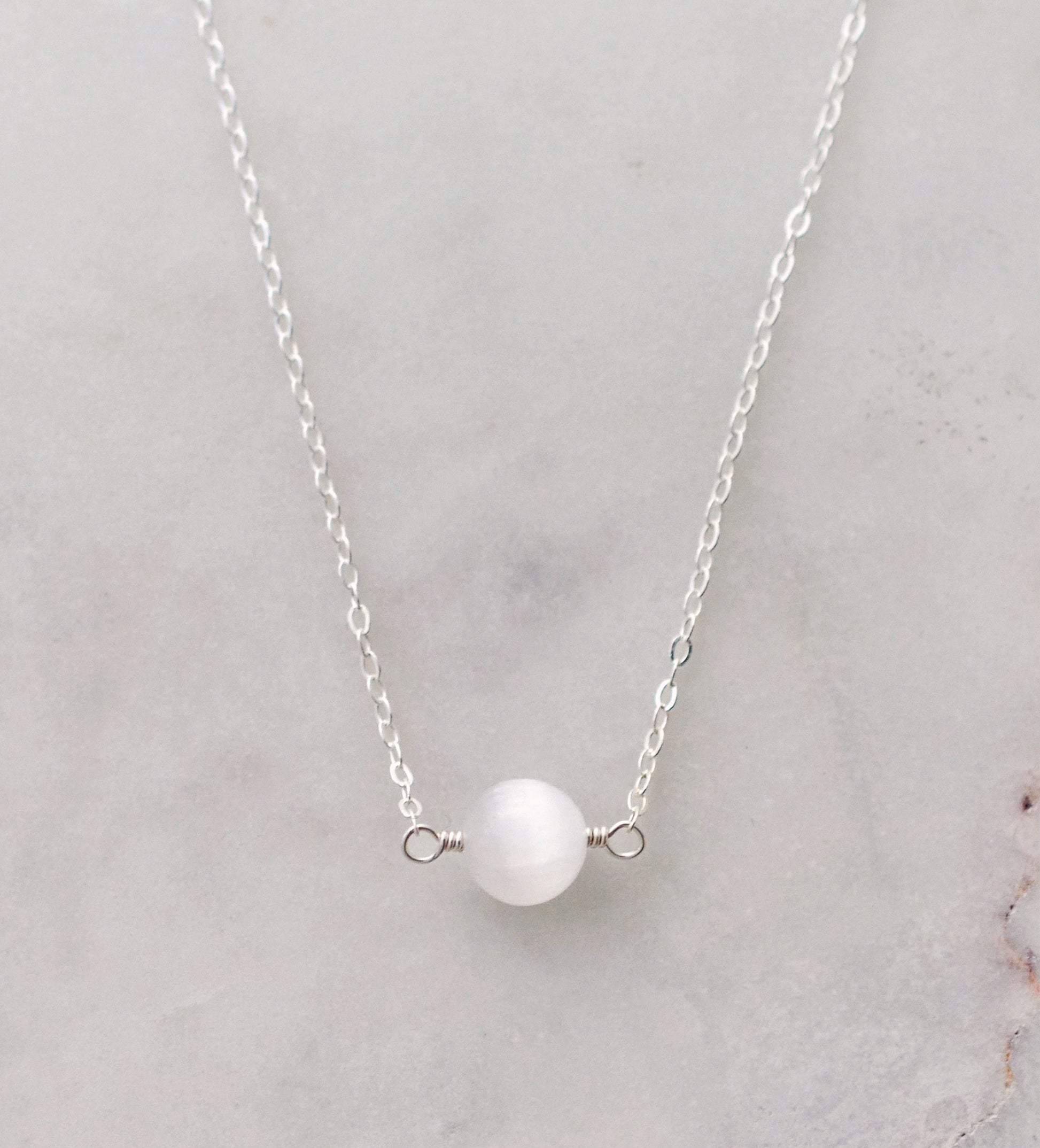 This necklace is handcrafted with a natural, smooth polished, round Selenite crystal suspended on a sterling silver or 14kt gold fill chain.