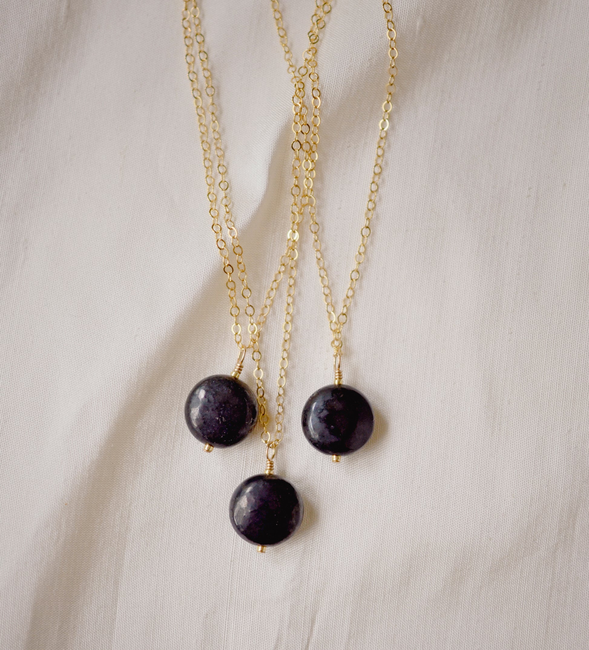 This necklace is handcrafted with a natural Shungite stone in a smooth polished coin shape. It can be made in sterling silver or 14k gold filled.