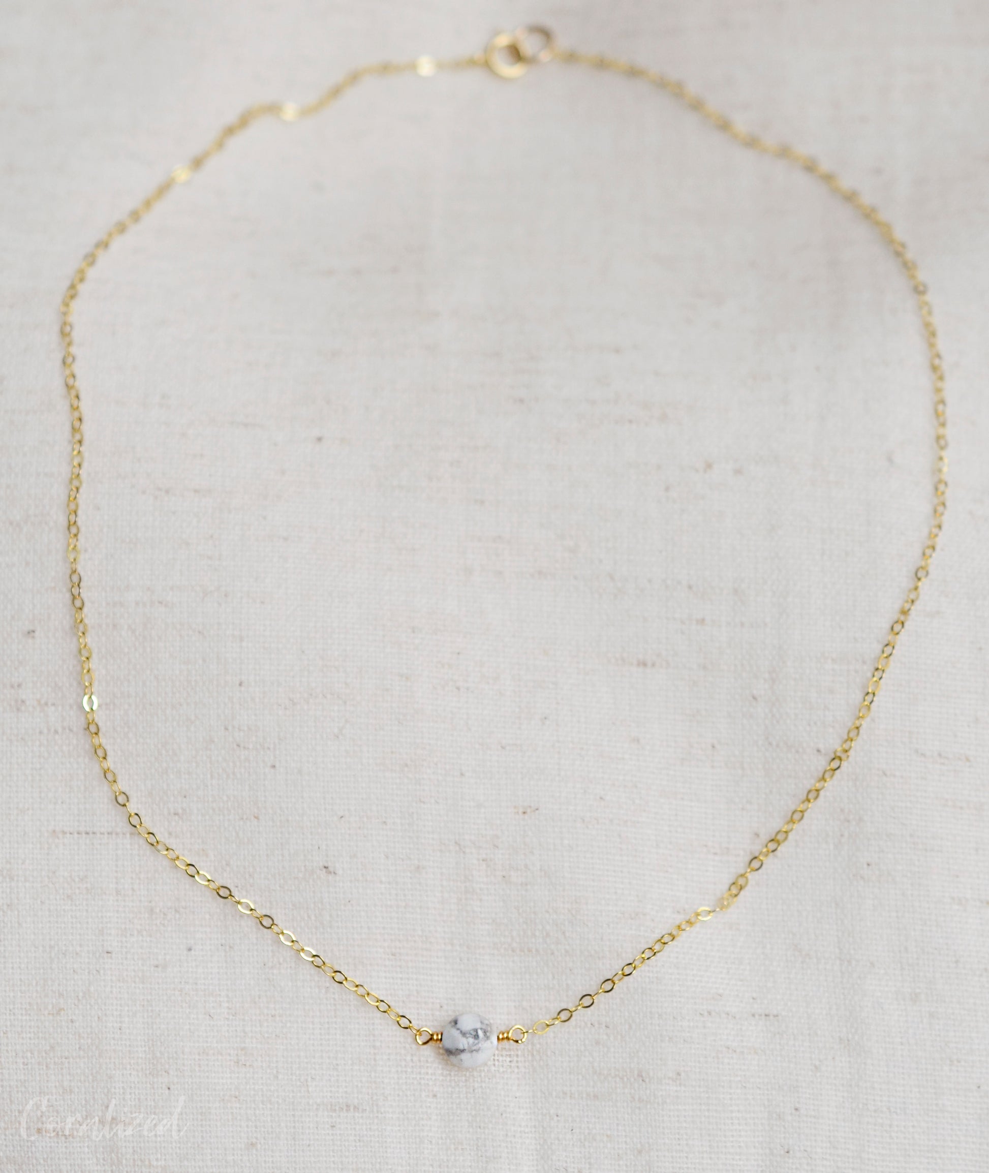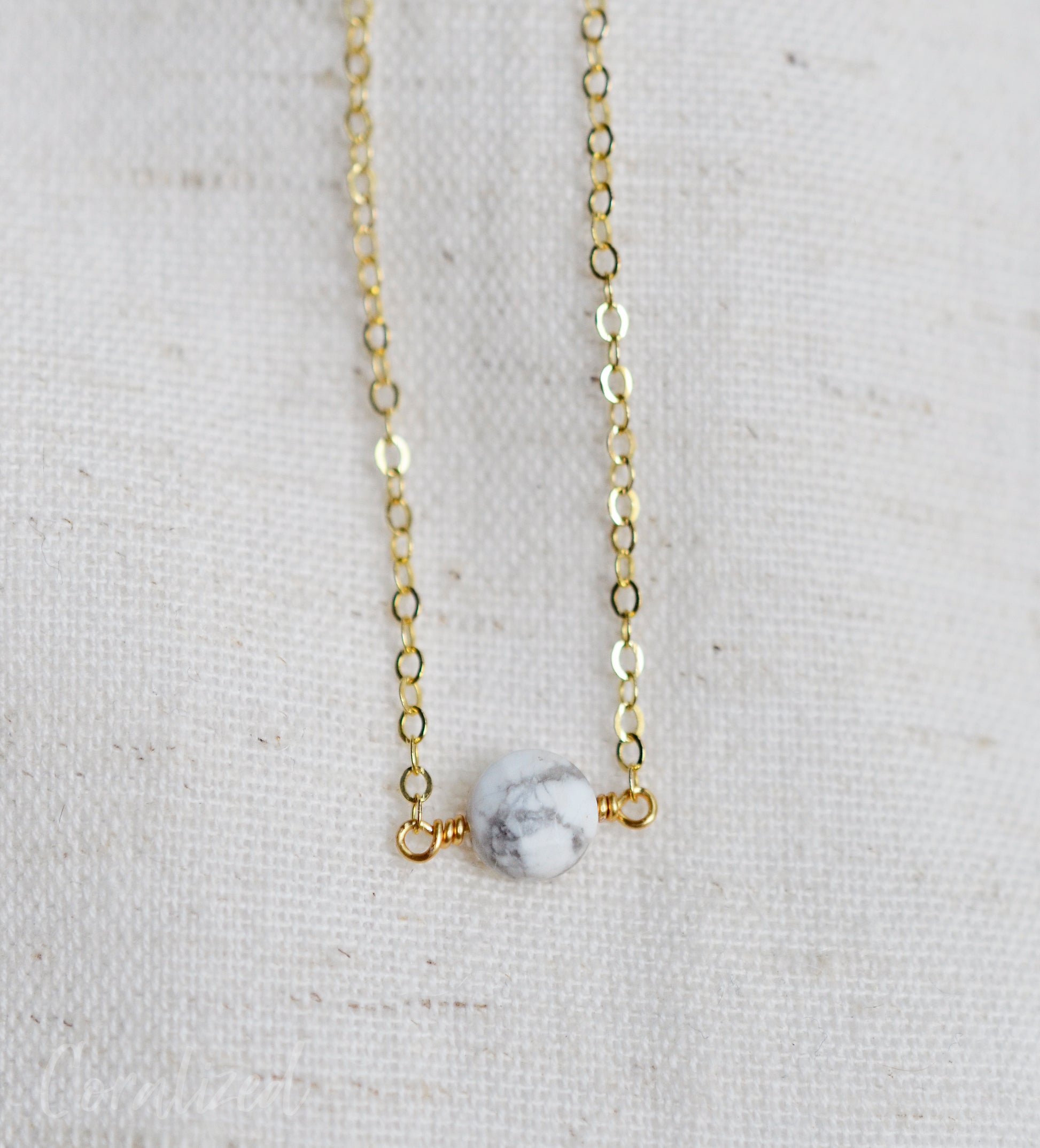 A small, faceted, coin shaped Howlite gemstone is featured on a sterling silver or 14kt gold filled chain. Each stone is natural and contains a variation of gray marbling. Some stones have a lot of marbling, while others are almost solid white.
