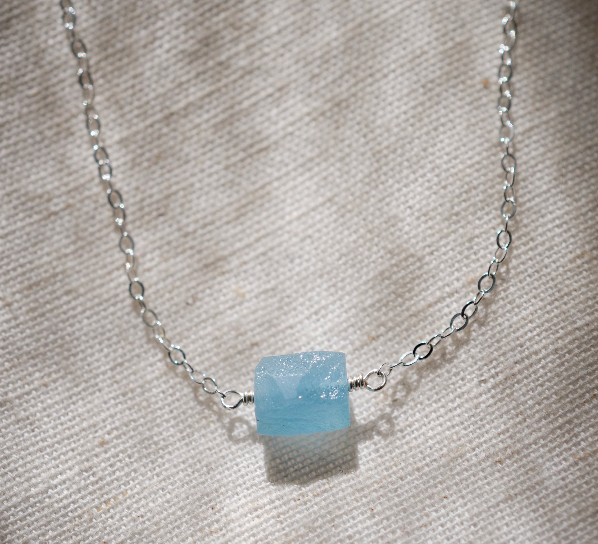 This bracelet is handcrafted with a natural, raw aquamarine crystal. Each stone is a raw slice of a crystal and irregular in shape. Chains are available in sterling silver or 14kt gold fill. The stone averages 6x10mm (.25x0.4 inches).
