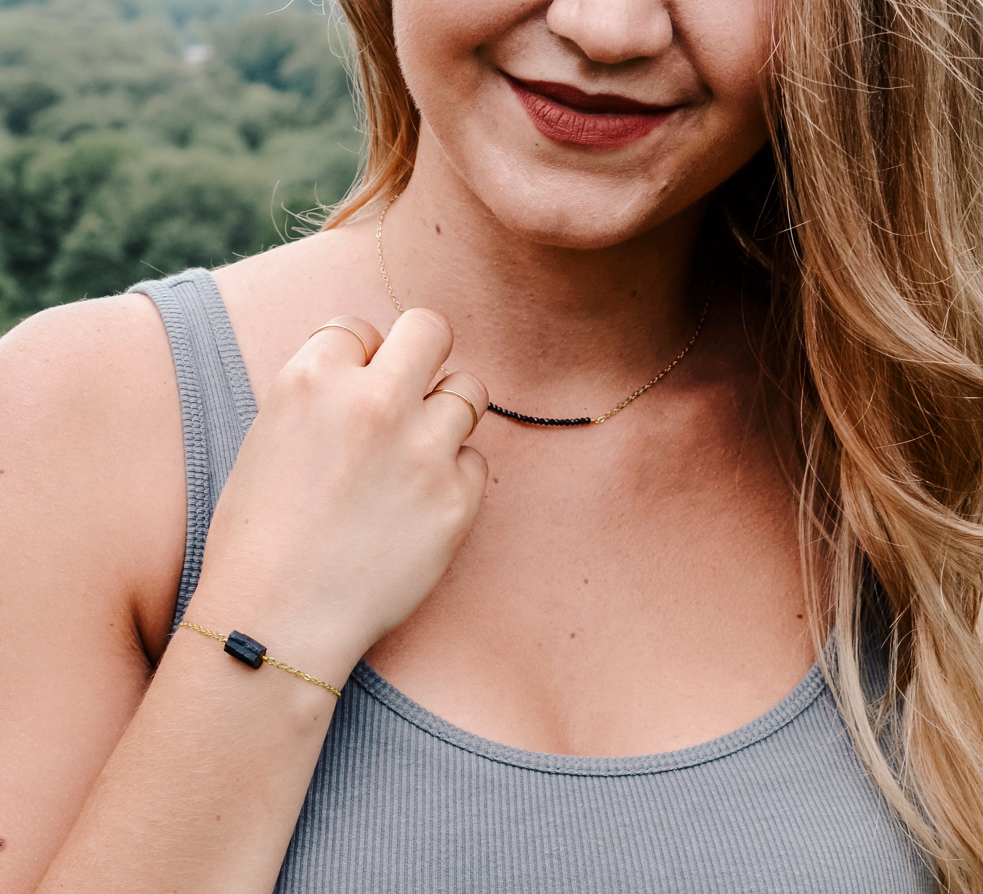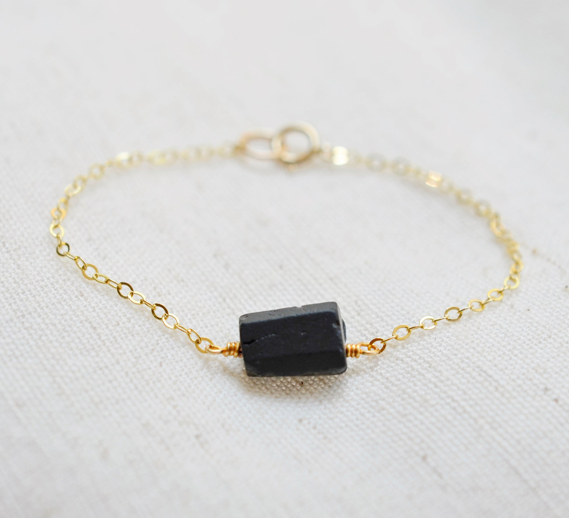 This bracelet is handcrafted with a natural, raw crystal of black Tourmaline. Each stone is a raw slice of a crystal. It is hexagonal in shape, but will have irregularities. It comes on your choice of a sterling silver or 14k gold fill chain.