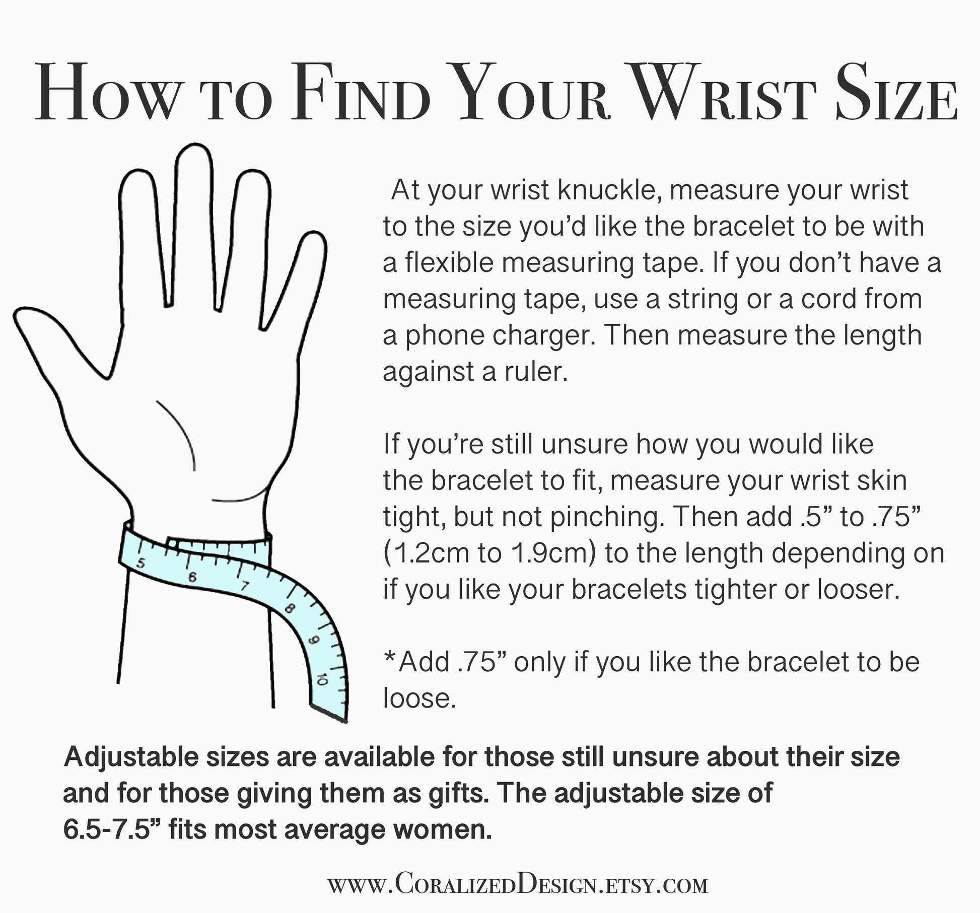 - Check the length against a ruler. Then, add .5" to .75" depending on how loose or tight you prefer your bracelets.
