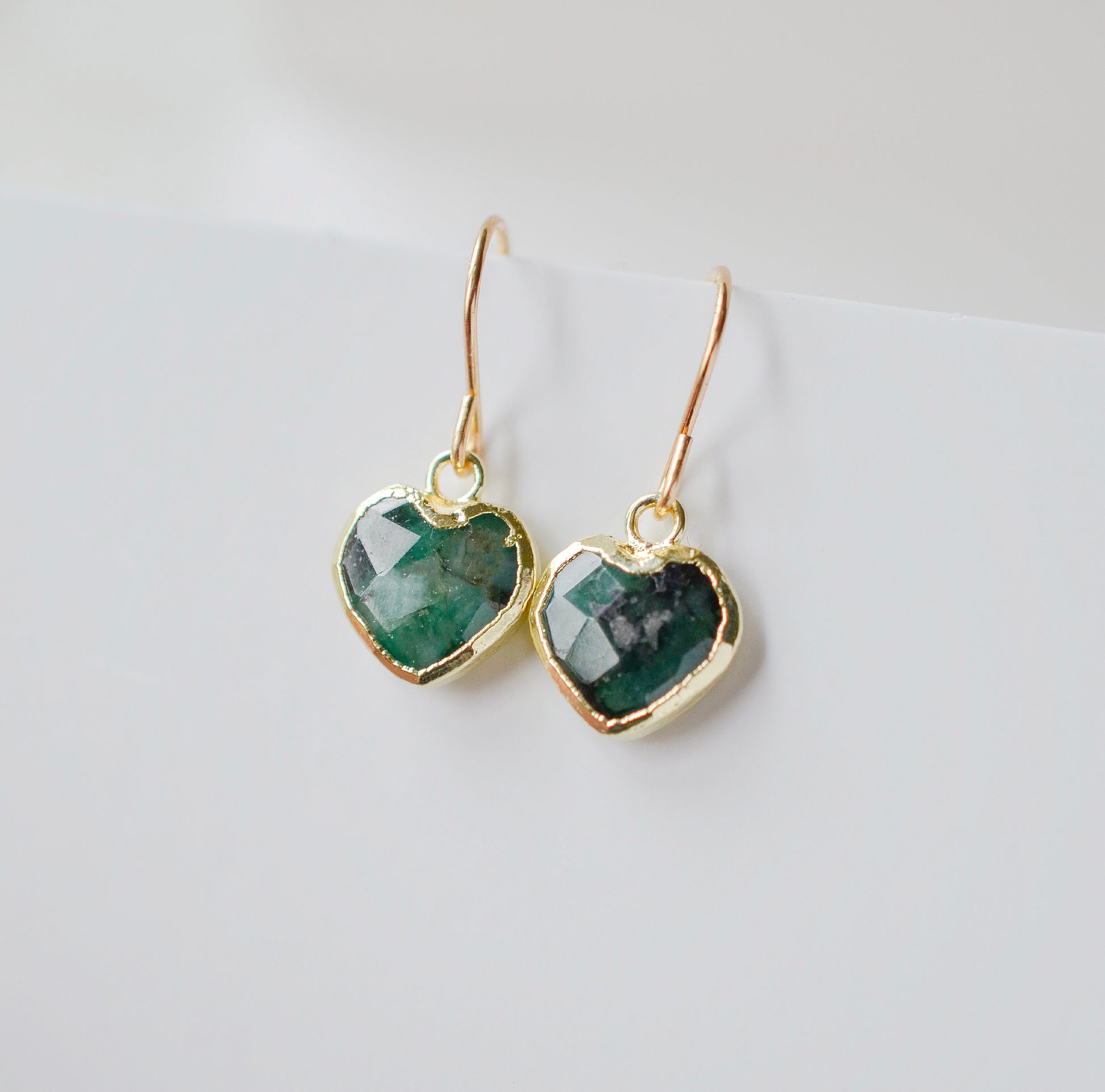 Nothing says love more than these genuine, Raw Emerald heart earrings! Great for an everyday minimalist style, these dainty dangles also make the perfect romantic gift for you, your wife, girlfriend, friend, or for Valentine's Day. Each stone is bezeled in 22k gold and set on 14k gold filled earring hooks. The stones vary in shades of green and dark green with many having flecks of black or white.