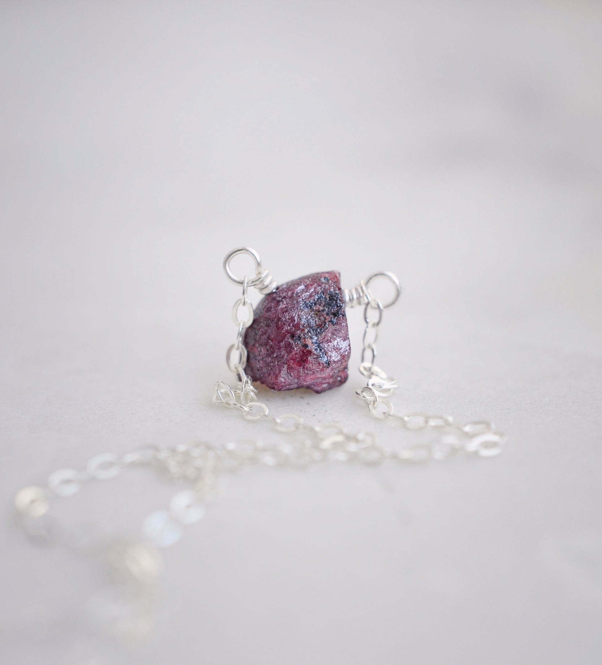 This necklace is handcrafted with a natural, raw Ruby. Each stone is different from the next in size and shape. Chains are available in sterling silver or 14k gold fill.