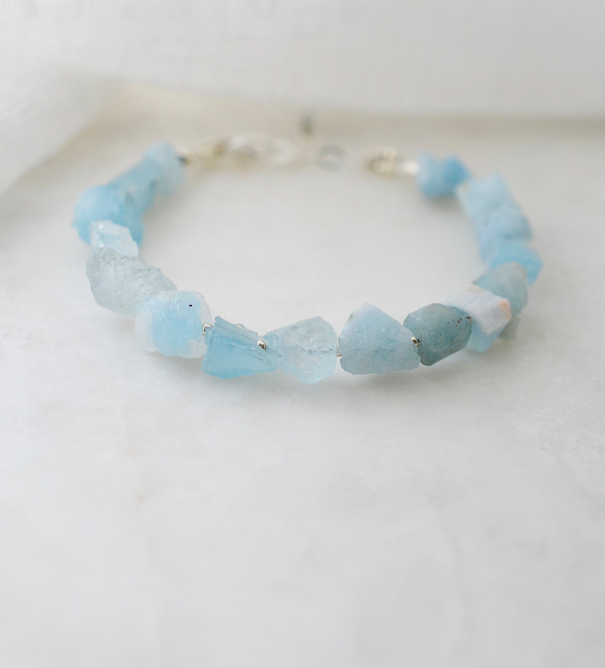 This bracelet is handmade with unpolished Aquamarine with tiny gold or silver beads in between. The clasp is sterling silver or 14k gold filled. Please measure your wrist before ordering. If purchasing as a gift the adjustable size of 6.5-7.5 inches fits most average women.
