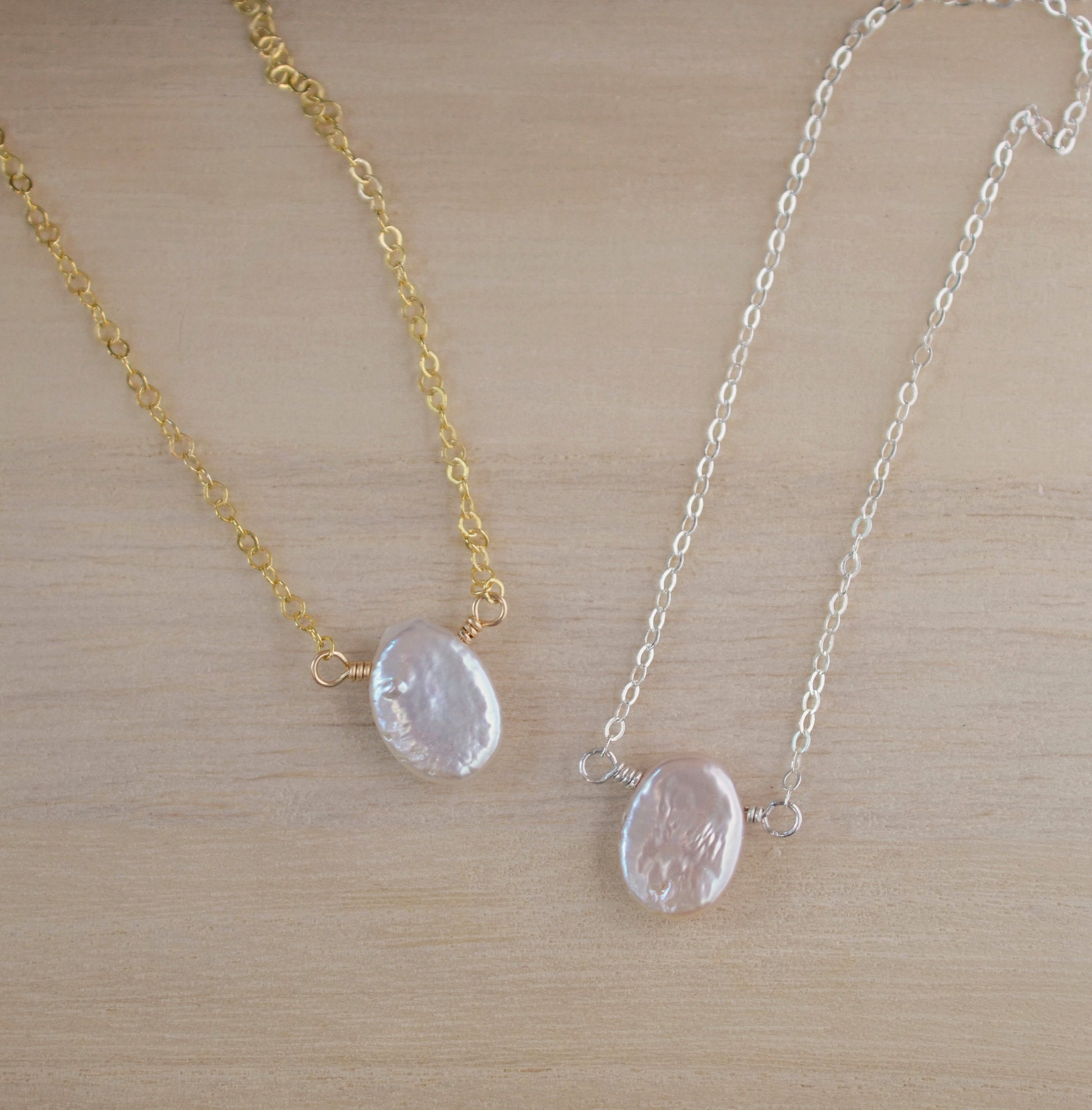 This necklace features a flat oval shaped freshwater pearl. Each pearl is different from the next with natural grooves and ridges along its surface. Chains are available in sterling silver or 14kt gold filled. The average pearl size is 12x9mm (.5x.35").
